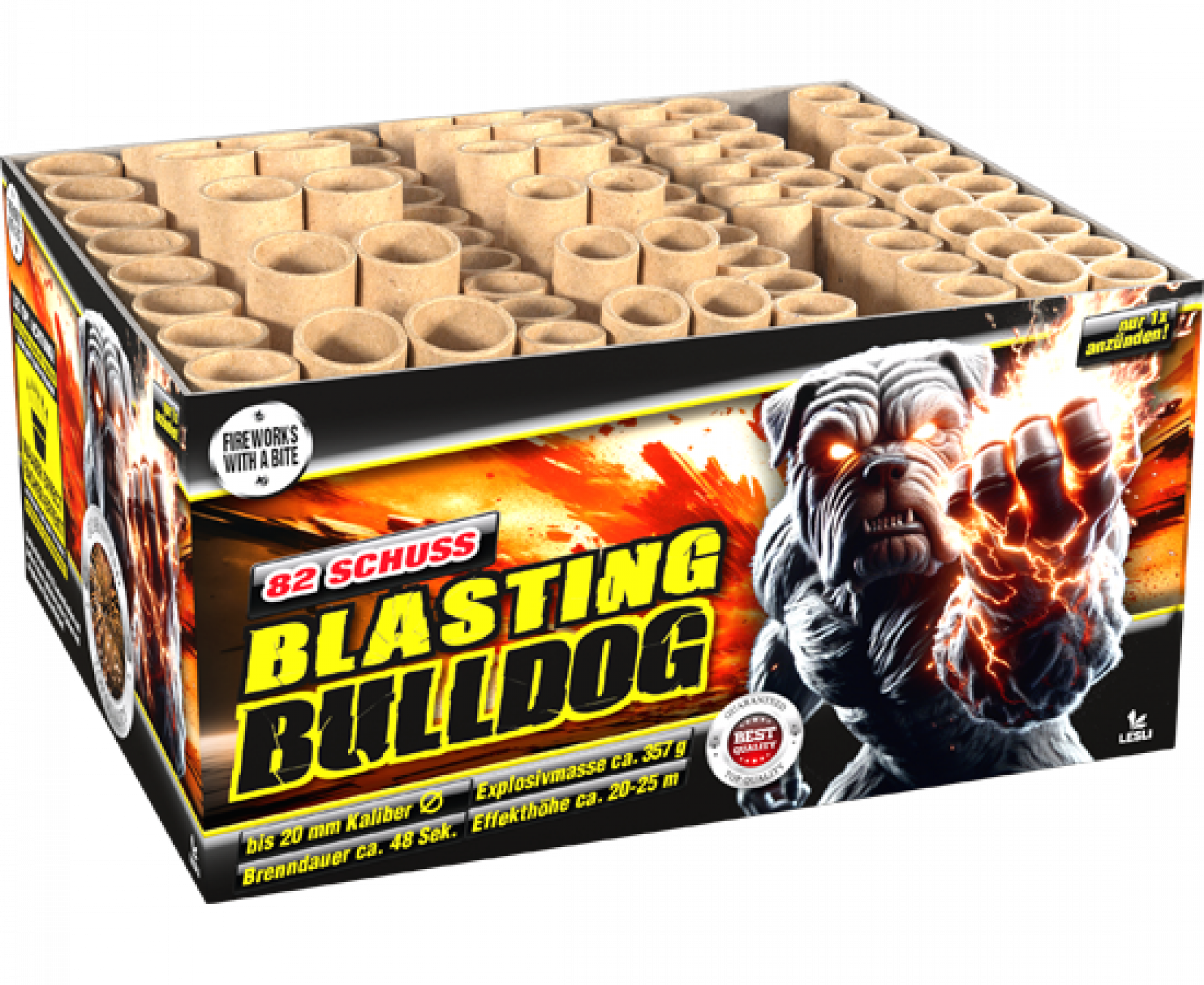 Brute batterij met 82 harde knallen en felle kleuren. Inclusief krachtige uitbarstingen en ingebouwde waaiereffecten!